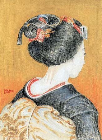 舞妓時代は髪型が色々に変化して行く。まず舞妓になると「割れしのぶ」、18歳になると「お福、もしくは福髷ともいう」に結いかえ、さらに何年か経って舞妓が芸妓になる時、その一月前からこの画のような絢爛豪華な髪型となる。その時期は、20歳から数年の間で、適当に関係者できめられる。後方にぴんと垂らした髪型は特徴的で、さらに、左前部に松に鶴の前座挿しがあり、鶴は金色の水引で華やかに作られてある。南ちゑ『日本の髪型』(紫紅社)にくわしい。各髪型は機会を見て作品の中から紹介するつもりです。