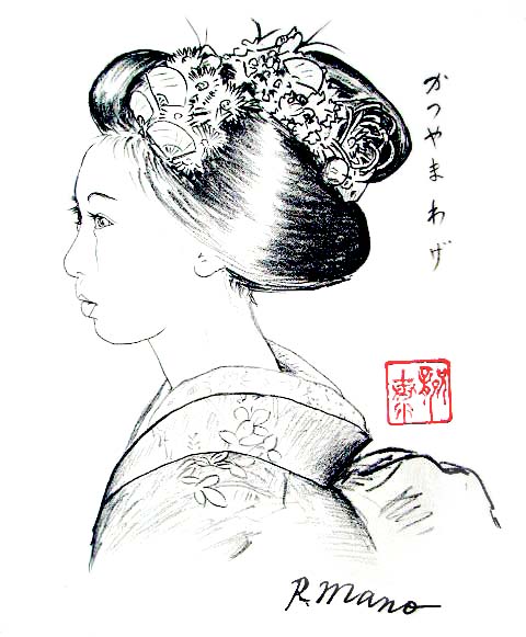 現代、7月の祇園祭の間、祇園、先斗町の舞妓が結う装飾的な勝山という髪型。薄羽蜻蛉の触覚のように繊細で細長いものをつけた蝶が何匹も花に止まっている花かんざしは、蒸し暑い京の街にも、そこだけ、ゆらゆらと揺れて涼しげである。