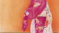 私は舞妓というと白塗りの先入観から長く抜けられず、また、日本画風の陰のない表現を続けてきたが、ある助言があって、もっと汚してみてはどうですか、といわれた。思いきって人形仕立てでなく、見えるままに描いてみた。思ったより実体感があり、我ながら一歩前進と思っていて、ある展覧会に出してみたら、担当の方が、これは是非くれと有り難い申し出があり、進呈した。ただし、平成13年3月に鳩居堂で真野個展の時は貸す、ということで。