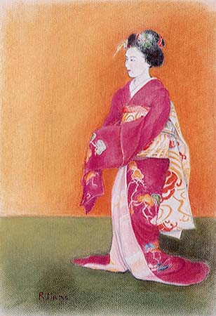 私は舞妓というと白塗りの先入観から長く抜けられず、また、日本画風の陰のない表現を続けてきたが、ある助言があって、もっと汚してみてはどうですか、といわれた。思いきって人形仕立てでなく、見えるままに描いてみた。思ったより実体感があり、我ながら一歩前進と思っていて、ある展覧会に出してみたら、担当の方が、これは是非くれと有り難い申し出があり、進呈した。ただし、平成13年3月に鳩居堂で真野個展の時は貸す、ということで。