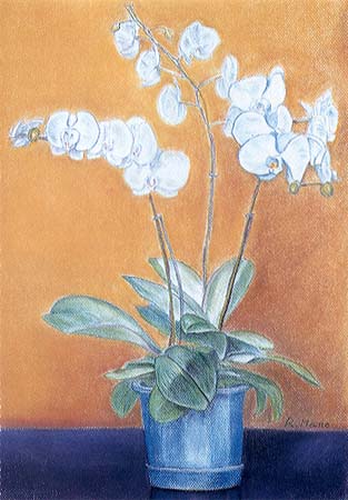 天光院の御檀家に蘭では、世界に名声の高い江尻光一さんがおられる。先代からの蘭の権威者で、しかも園芸一般にも権威者でNHKの番組でも知られている方です。しかし、とても親切な指導をされていて、私も孫を連れてその農園にお邪魔したりしています。時々、素晴らしい蘭を頂きますと、ただ眺めるだけでは勿体なく、スケッチしたり、パステルで描いたりさせてもらっています。幸いなことに蘭は花期が長く、筆の運びの遅い私の画材にふさわしいです。それでも描いていて長くなると花が落ちてしまうことがあります。
