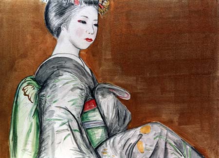 私の最高に好きな名曲。曲半ばの歌詞のない間奏の部分が嫋々たる詩情を醸し出す。舞妓が襟替え、即ち、卒業記念に舞う。一番初歩にも習う。途中で半座で舞うのも珍しい。画はその姿。座らない他流の黒髪もあるよう。因みに、清水市にも可愛い舞妓さんが誕生しているが、ここでは舞(踊りというのか)は、先ず、朗らかに、ちゃっきり節から始まる。