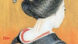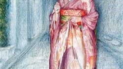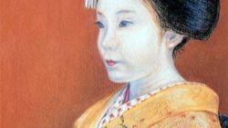 京都の春は知恩院の御忌と都踊りで華やかに開幕。この舞妓さんは真野香と言い真野共通である。襟の赤の縫い取り模様や全体の雰囲気で,まだ出て一,二年と知られる。帯の後ろには家紋が織られ,どこのそれと分かり,名誉にかけた振る舞いを誓う。「都踊りはよ...